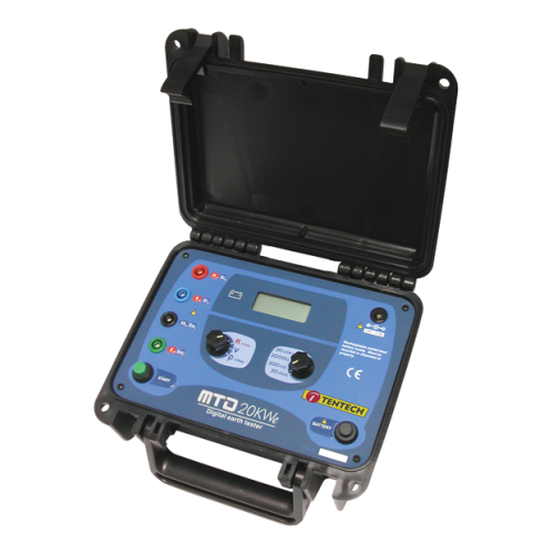 The MTD-20KWe digital earth tester allows for the measurement of Earth Resistances and Soil Specific Resistivity, and also the spurious voltages caused by parasitic voltages present in the soil.