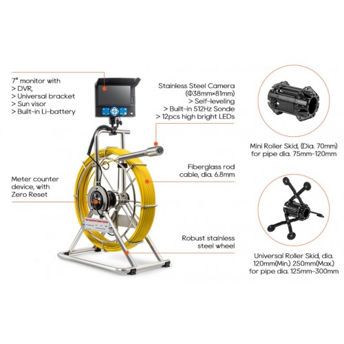 This is a Drain/Pipe Inspection Camera that comes with self-leveling feature 38mm camera head, a removeable 7inch LCD monitor with DVR, a 40-60m fiberglass push cable reel, all parts (including camera head, monitor, cable etc) are mounted on a robust stainless-steel wheel.